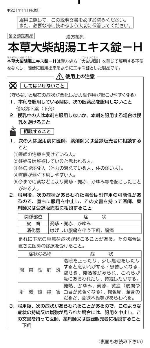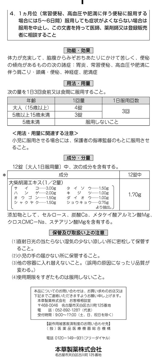 | ・12錠(大人の1日服用量)中、次の成分を含有する。 大柴胡湯エキス(1/2量):1.70g (サイコ3.00g、ハンゲ2.00g、オウゴン1.50g、シャクヤク1.50g、タイソウ1.50g、キジツ1.00g、ダイオウ1.00g、ショウキョウ0.75gより抽出) 添加物として、セルロース、炭酸Ca、メタケイ酸アルミン酸Mg、クロスCMC-Na、ステアリン酸Mgを含有する。 |