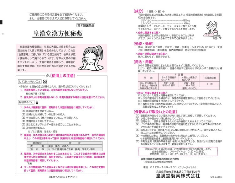 ●皇漢堂漢方便秘薬は、生薬の大黄に甘草を配合した漢方処方「大黄甘草湯」を主成分としており、これは「金匱要略」に掲げられいる漢方処方で、古来より広く便秘薬として用いられています。