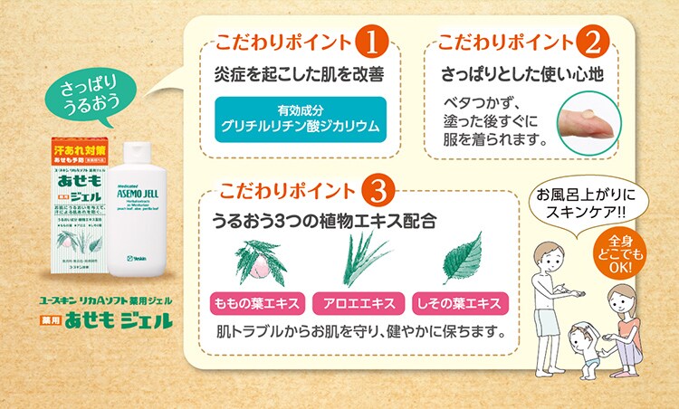 お風呂上がりの清潔なお肌に薬用あせもジェルでしっかりうるおいを与え、「汗あれ」を防ぎます!