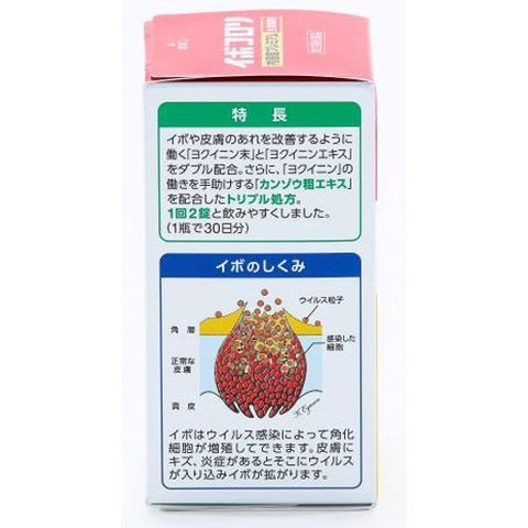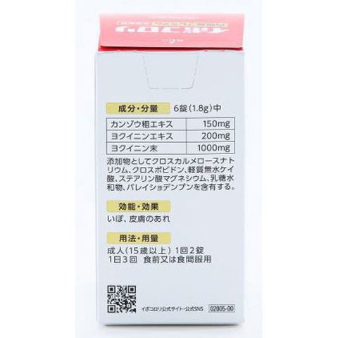 | 本剤6錠(1.8g)中 カンゾウ粗エキス:150mg ヨクイニンエキス:200mg ヨクイニン末:1000mg 添加物としてクロスカルメロースナトリウム、クロスポビドン、軽質無水ケイ酸、ステアリン酸マグネシウム、乳糖水和物、バレイショデンプンを含有する。 ・本剤は淡黄褐色で、特異なにおいを有し、味は甘い素錠です。 ・本剤は天然の生薬を原料としていますので、多少色調の異なることがありますが、効果に変わりはありません。 |