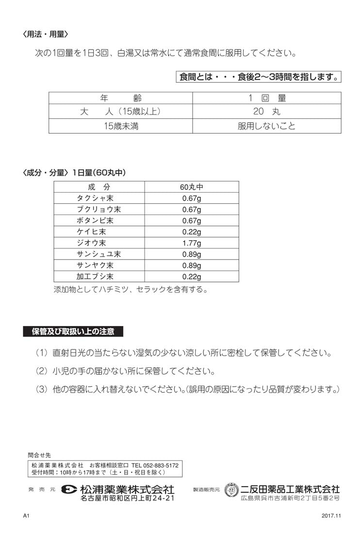 | (1日量60丸中) タクシャ末:0.67g ブクリョウ末:0.67g ボタンピ末:0.67g ケイヒ末:0.22g ジオウ末:1.77g サンシュユ末:0.89g サンヤク末:0.89g 加工ブシ末:0.22g 添加物として、ハチミツ、セラックを含有する。 |