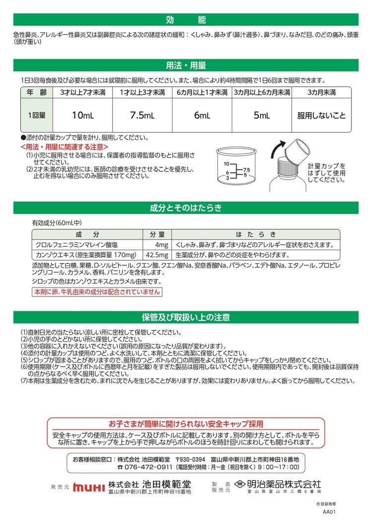 | 有効成分(60mL中) [成分:分量:はたらき] クロルフェニラミンマレイン酸塩:4mg:くしゃみ、鼻みず、鼻づまりなどのアレルギー症状をおさえます。 カンゾウエキス(原生薬換算量170mg):42.5mg:生薬成分が、鼻やのどの炎症をやわらげます。 添加物として、白糖、果糖、D-ソルビトール、クエン酸、クエン酸Na、安息香酸Na、パラベン、エデト酸Na、エタノール、プロピレングリコール、カラメル、香料、バニリンを含有します。 ・シロップの色はカンゾウエキスとカラメル由来です。 ・本剤に卵、牛乳由来の成分は配合されていません |