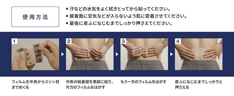 ・プラスチックフィルムをはがし、1日1回1-2枚を患部に貼ってください。ただし、1回あたり2枚を超えて使用しないでください。なお、本成分を含む他の外用剤を併用しないでください。