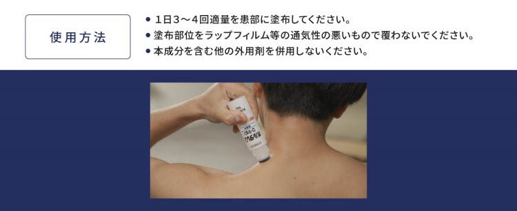 ・1日3-4回適量を患部に塗布してください。ただし、塗布部位をラップフィルム等の通気性の悪いもので覆わないでください。なお、本成分を含む他の外用剤を併用しないでください。