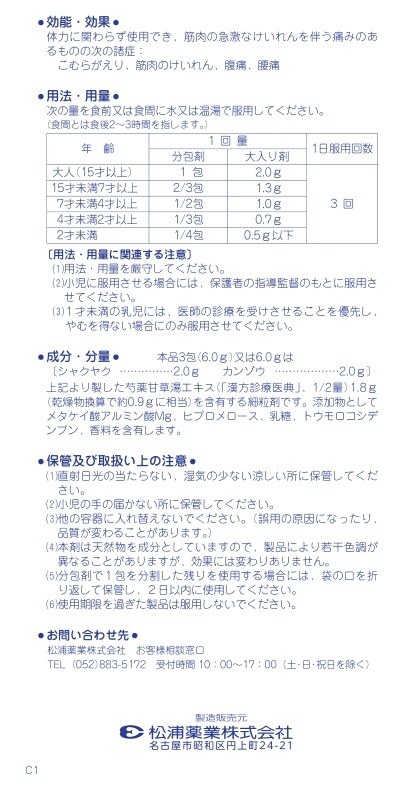 | 本品3包(6.0g)又は6.0gは (シャクヤク・カンゾウ各2.0g) 上記より製した芍薬甘草湯エキス(「漢方診療医典」、1/2量)1.8g(乾燥物換算で約0.9gに相当)を含有する細粒剤です。 添加物としてメタケイ酸アルミン酸Mg、ヒプロメロース、乳糖、トウモロコシデンプン、香料を含有します。 |
