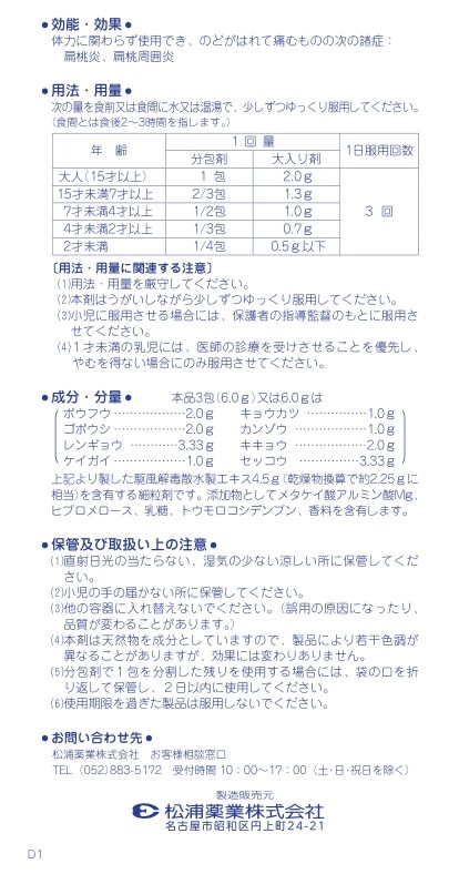| 本品3包(6.0g)又は6.0gは (ボウフウ・ゴボウシ・キキョウ各2.0g、レンギョウ・セッコウ各3.33g、ケイガイ・キョウカツ・カンゾウ各1.0g) 上記より製した風解毒散水製エキス4.5g(乾燥物換算で約2.25gに相当)を含有する細粒剤です。 添加物としてメタケイ酸アルミン酸Mg、ヒプロメロース、乳糖、トウモロコシデンプン、香料を含有します。 |