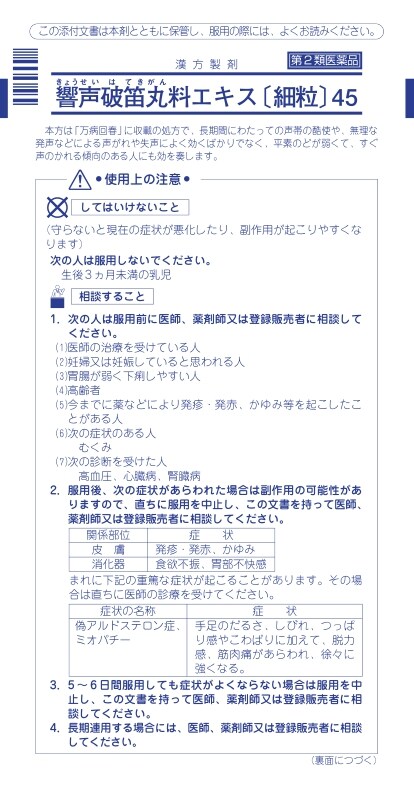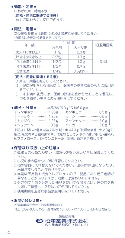 | 本品3包(6.0g)又は6.0gは (レンギョウ・キキョウ・カンゾウ各1.25g、シュクシャ・センキュウ・カシ各0.5g、アセンヤク1.0g、ハッカ2.0g) 上記より製した響声破笛丸料水製エキス4.0g(乾燥物換算で約2.0gに相当)を含有する細粒剤です。 添加物としてメタケイ酸アルミン酸Mg、ヒプロメロース、D-マンニトール、乳糖、香料を含有します。 |