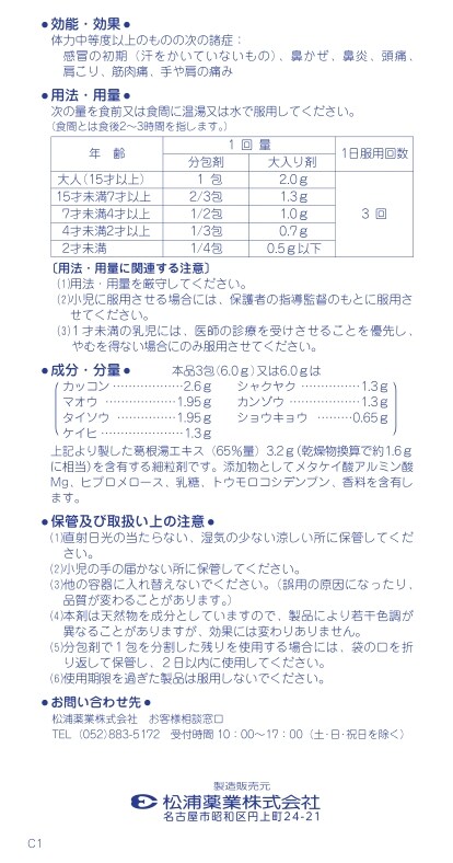 | 本品3包(6.0g)又は6.0gは (カッコン 2.6g、マオウ 1.95g、タイソウ 1.95g、ケイヒ 1.3g、シャクヤク 1.3g、カンゾウ 1.3g、ショウキョウ 0.65g) 上記より製した葛根湯エキス(65%量)3.2g(乾燥物換算で約1.6gに相当)を含有する細粒剤です。添加物としてメタケイ酸アルミン酸Mg、ヒプロメロース、乳糖、トウモロコシデンプン、香料を含有します。 |
