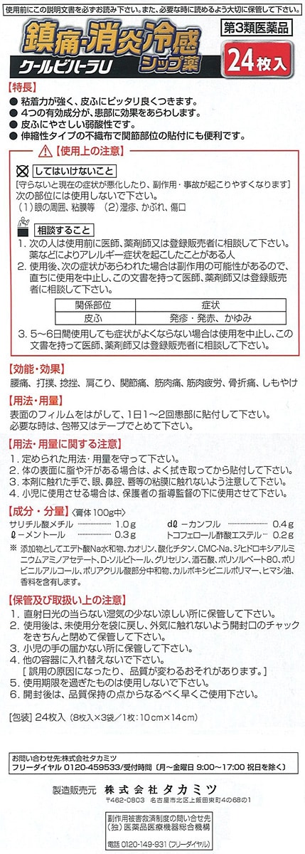 | ・腰痛、打撲、捻挫、肩こり、関節痛、筋肉痛、筋肉疲労、骨折痛、しもやけ |