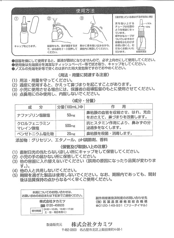 成人(15歳以上)、および7歳以上の小児:1回に1~2度ずつ、1~5回、鼻腔内に噴霧してください。なお、適応間隔は、3時間以上おいてください。