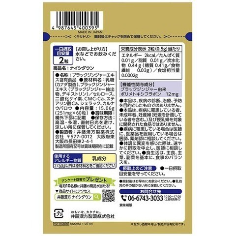 | 2粒(0.5g)あたり エネルギー:2kcal、たんぱく質:0.01g、脂質:0.01g、炭水化物:0.44g(糖質:0.41g、食物繊維:0.03g)、食塩相当量:0.0002g 機能性関与成分 ブラックジンジャー由来ポリメトキシフラボン:12mg |