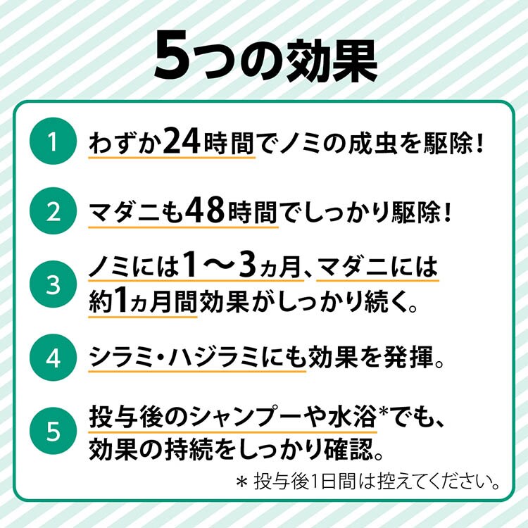 | 犬:ノミ、マダニ、シラミ及びハジラミの駆除 ノミ卵の孵化阻害及びノミ幼虫の変タイ阻害によるノミ寄生予防 |
