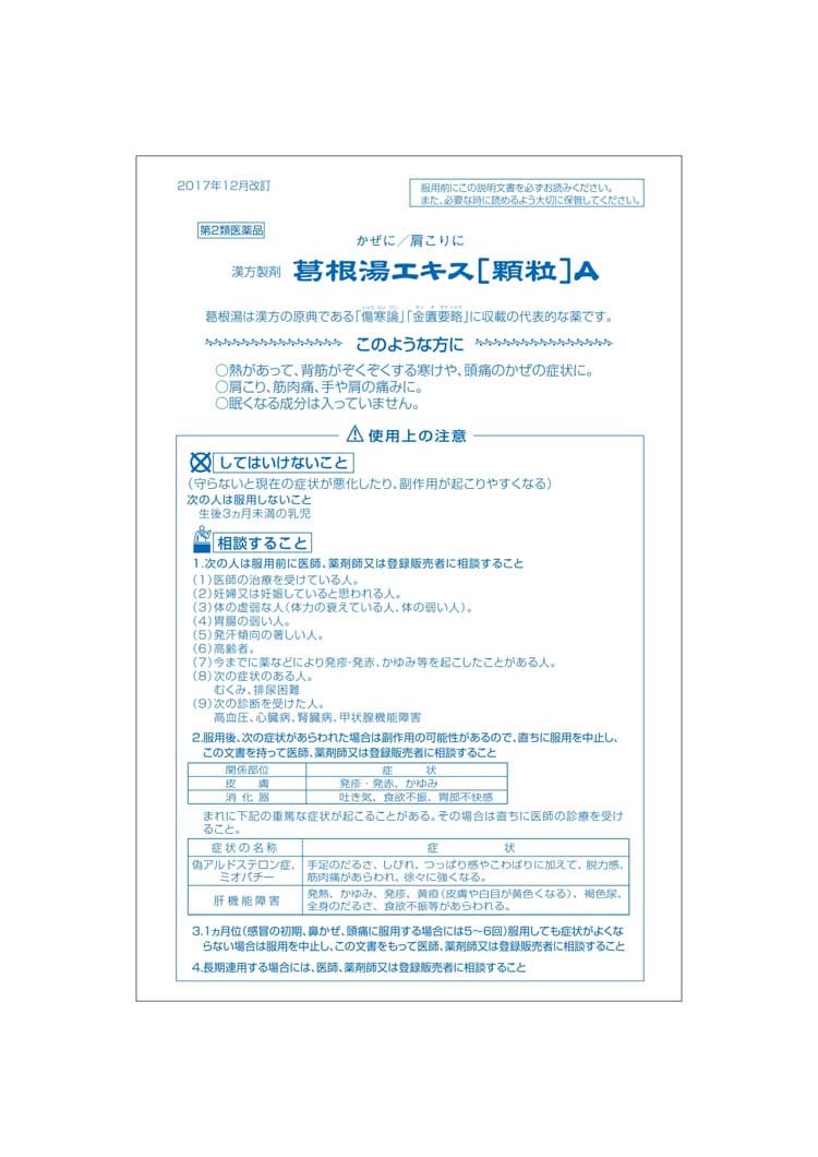 | 本剤3包(1包1.5g)中 日局カッコン:4.0g 日局マオウ:3.0g 日局タイソウ:3.0g 日局ケイヒ:2.0g 日局シャクヤク:2.0g 日局カンゾウ:2.0g 日局ショウキョウ:1.0g より抽出した葛根湯エキス1700mgを含有しています。 添加物として乳糖水和物、D-マンニトール、ヒドロキシプロピルセルロース、ステアリン酸マグネシウムを含みます。 ★成分に関する注意 ※本剤は天然物(生薬)のエキスを用いていますので、顆粒の色が多少異なることがありますが効能・効果にはかわりありません。 ※水分が付きますと、品質の劣化を招きますので、誤って水滴を落としたり、ぬれた手で触れないでください。 ※湿気などにより薬が固化することがありますので、1包を分割した残りを服用する場合には、袋の口を折り返して保管し、なるべく1日以内に服用してください。 |