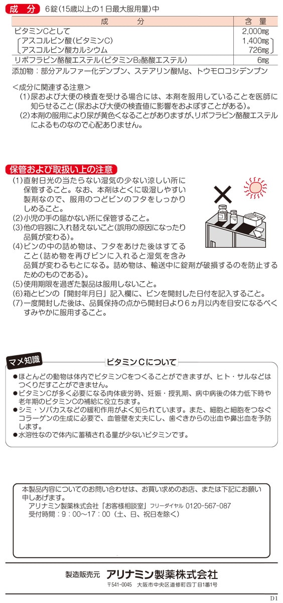 | 6錠(15歳以上の1日最大服用量)中 ビタミンCとして:2000mg (アスコルビン酸(ビタミンC):1400mg、アスコルビン酸カルシウム:726mg) リボフラビン酪酸エステル(ビタミンB2酪酸エステル):6mg 添加物:部分アルファ―化デンプン、ステアリン酸Mg、トウモロコシデンプン ★成分に関する注意 (1)尿および大便の検査を受ける場合には、本剤を服用していることを医師に知らせること(尿および大便の検査値に影響をおよぼすことがある)。 (2)本剤の服用により尿が黄色くなることがありますが、リボフラビン酪酸エステルによるものなので心配ありません。 |