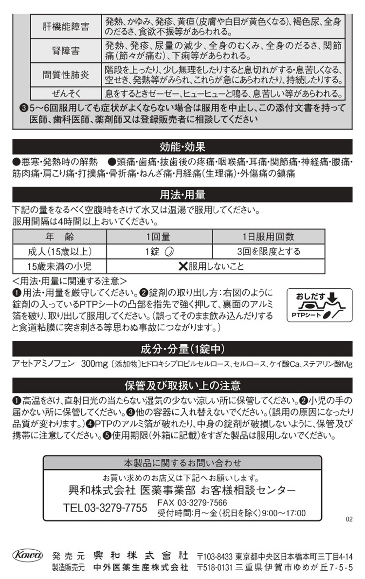 | (1錠中) アセトアミノフェン:300mg (添加物)ヒドロキシプロピルセルロース、セルロース、ケイ酸Ca、ステアリン酸Mg |