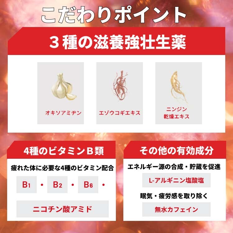 | ・疲労の回復、予防 ・日常生活における栄養不良に伴う身体不調の改善、予防 ・疲れやすい、疲れが残る、体力がない、身体が重い、身体がだるい、肩、首、腰又は膝の不調、冷えやすい、血行が悪い、肌の不調(肌荒れ、肌の乾燥)、二日酔いに伴う食欲の低下、だるさ ・体力、身体抵抗力又は集中力の維持・改善 ・虚弱体質(加齢による身体虚弱を含む。)に伴う身体不調の改善・予防 ・病中病後の体力低下時、発熱を伴う消耗性疾患時、食欲不振時、妊娠授乳期又は産前産後等の栄養補給 |