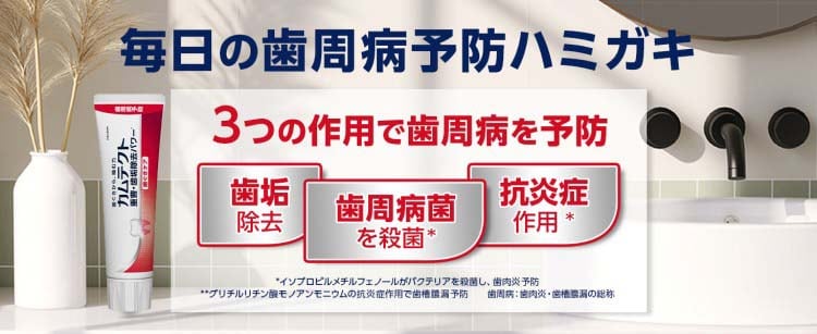 ●IPMP(イソプロピルメチルフェノール)による殺菌作用で、歯周病菌の殺菌・歯肉炎予防。