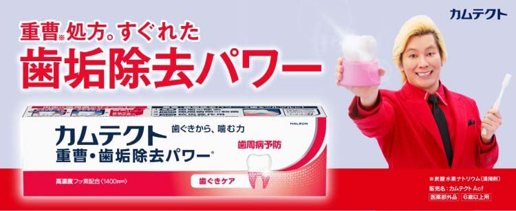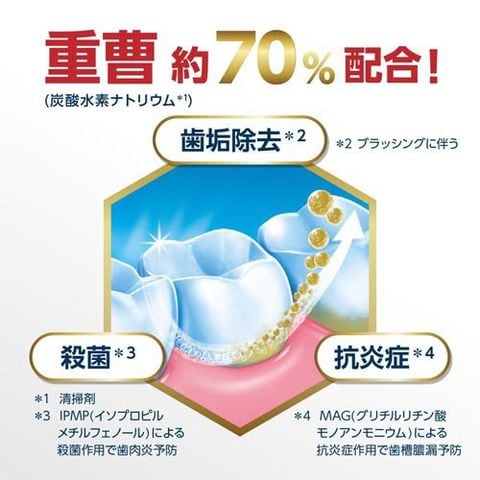 | 清掃剤:炭酸水素ナトリウム(重曹)、湿潤剤:濃グリセリン、清涼剤:ハッカ油、L-メントール、発泡剤:ヤシ油脂肪酸アミドプロピルベタイン、粘度調整剤:キサンタンガム、香味剤:香料(オリジナルミント)、サッカリンNa、薬用成分:フッ化ナトリウム(フッ素)、イソプロピルメチルフェノール(IPMP)、グリチルリチン酸モノアンモニウム(MAG)、着色剤:黄酸化Fe、赤227 |