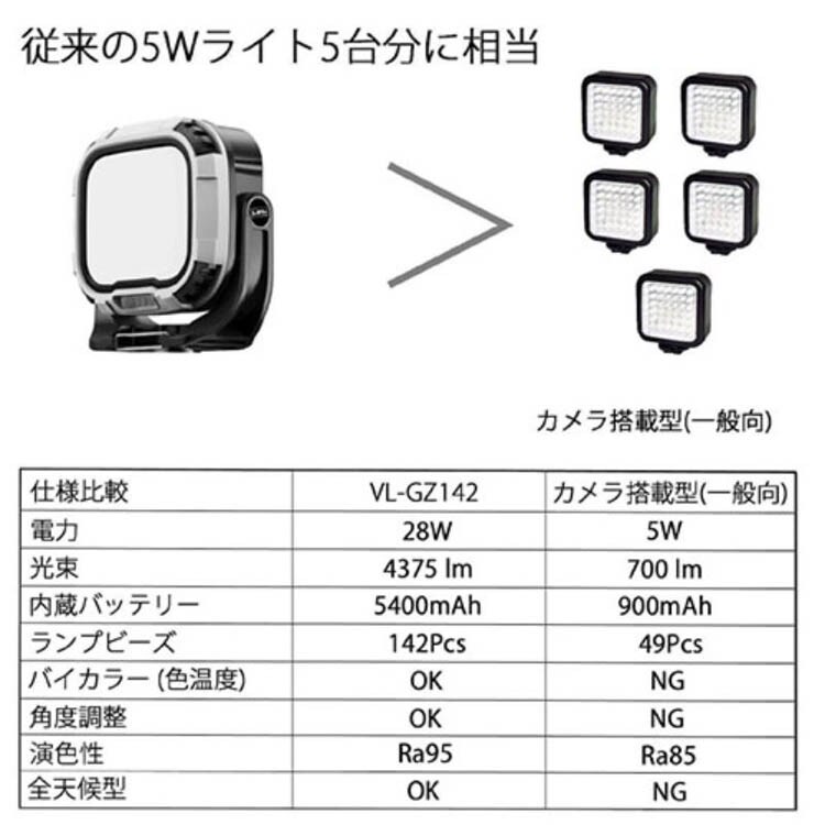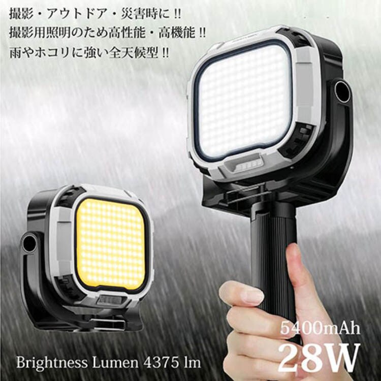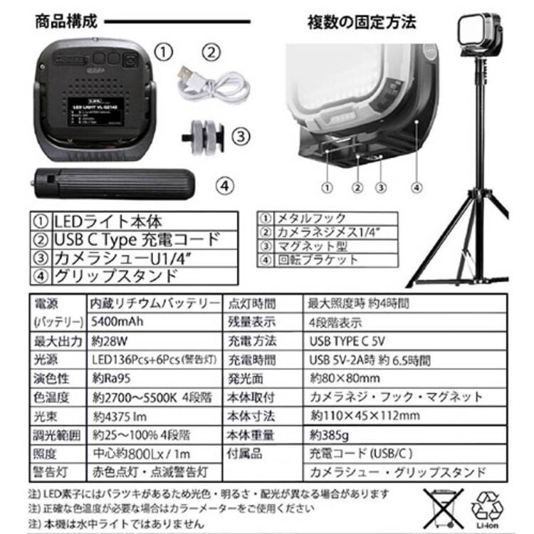 | 電源:内蔵リチウムバッテリー バッテリー:5400mAh 最大出力:約28W 光源:LED142Pcs 演色性:約Ra95 色温度:約2700~5500K 本体寸法:約110X45X110mm 本体寸法:約385g 保証期間:1年間 生産国:日本 |