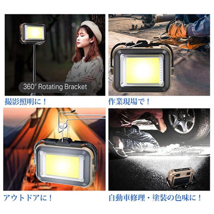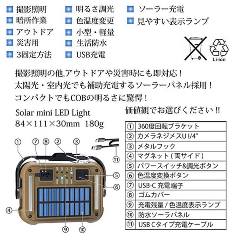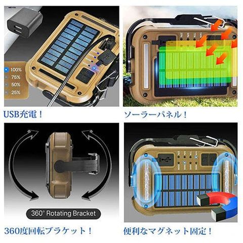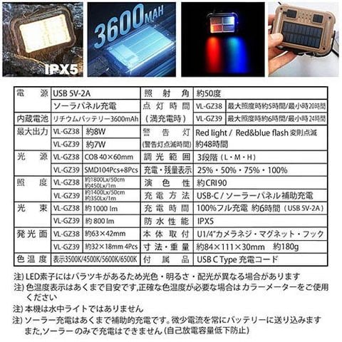| ・電源:USB 5V-2A ソーラーパネル充電 ・内蔵電池:チウムバッテリー3600mAh ・防水性能:IPX5 ・演色性:CRI90 ・最大出力:8W ・光束:1000 lm ・調光範囲:3段階 (ロー・ミドル・ハイ) ・色温度:表示3500K/4500K/5600K/6500K ・充電時間:約6時間 (USB 5V-2A) ・点灯時間:照度最大約5時間/最小20時間 ・寸法:84×111×30mm ・重量:180g ・付属品:充電コード ・保証期間:1年間 ・生産国:日本 |