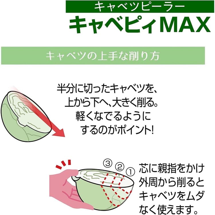 ●しかし、千切りは削る手間が大変で、なかなか気軽に手が出せないという方も多いのではないでしょうか。そこで開発したのが、面倒だった千切りキャベツを手早く大量に作れる、2枚刃構造のピーラー「ののじ キャベピィMAX」です。