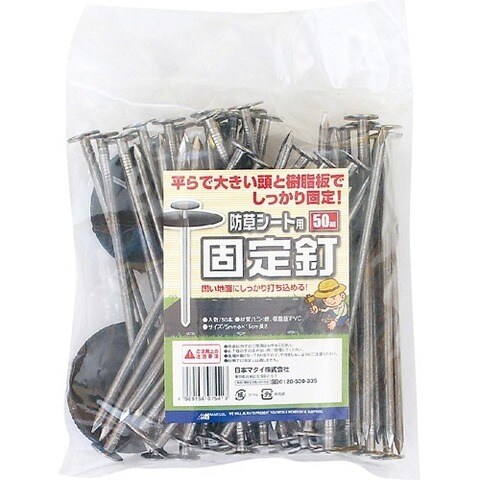 平で大きい頭と樹脂板でしっかり固定できる雑草防止シート・グッズです。防草シートの固定用釘。固い地面にしっかり打込めます。入数:50個。サイズ:5mm径×長さ15cm。