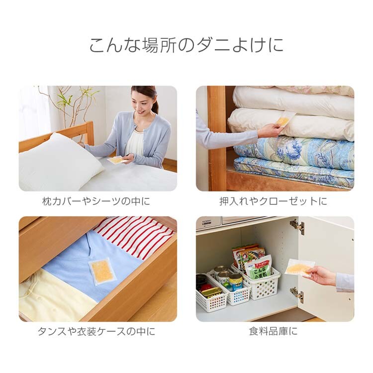 ●ダニが来て欲しくないふとんの下や枕カバー、タンスや衣装ケース、食料品庫などに。