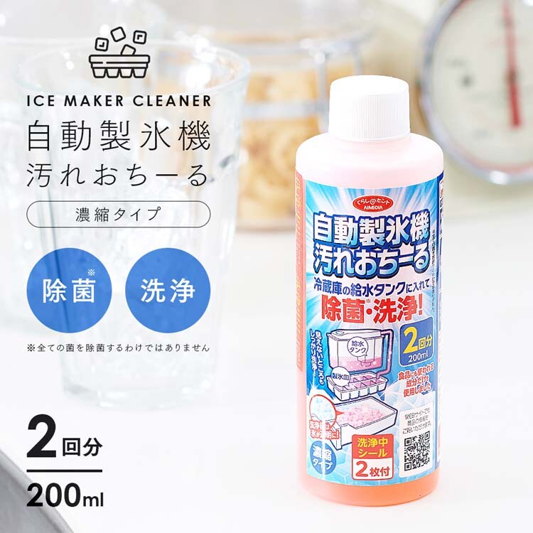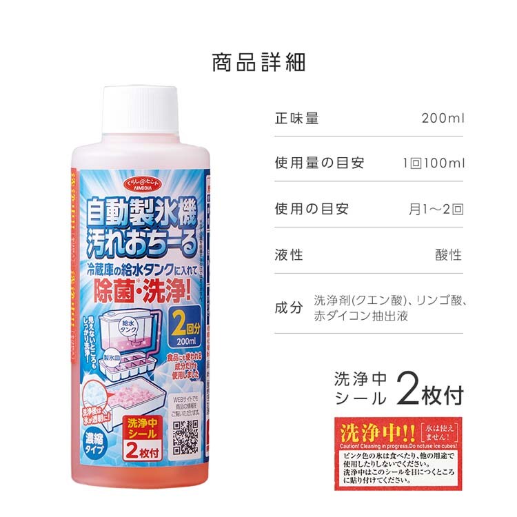 | ・内容量:200ml ・セット内容:本体1本、洗浄中シール2枚 ・成分:洗浄剤(クエン酸)・リンゴ酸・赤ダイコン抽出液 ・液性:酸性 ・用途:家庭用冷蔵庫の自動製氷機の洗浄 ・使用量目安:1回100ml ・使用の目安:月1~2回 |