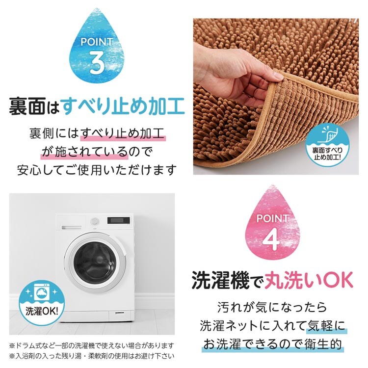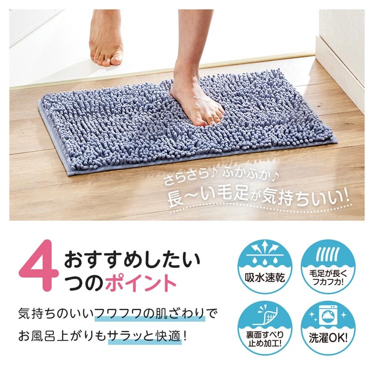 ●さらさら、ふかふかの長い毛足が気持ちいいマイクロファイバーバスマット。肌ざわりが良くお風呂上がりもサラッと快適!