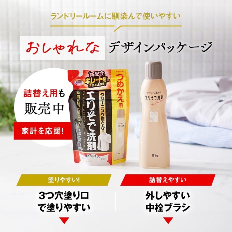落ちにくいエリやそでの嫌な汚れに直接塗って洗濯機で洗うだけで簡単に汚れが落とせます。