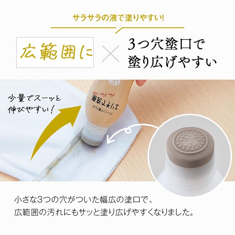 ●お客様の声から:(1)ランドリールームに馴染むおしゃれなパッケージでデザイン性◎!(2)3つ穴塗り口で塗りやすい! 小さな3つの穴がついた幅広の塗口で、広範囲の汚れにもサッと塗り広げやすい。サラサラの液で塗りやすさも◎!(3)外しやすい 中栓ブラシで詰替えやすさ◎!塗口の側面に凹凸がついているので、中栓ブラシが外しやすく、簡単に詰替えやすい。