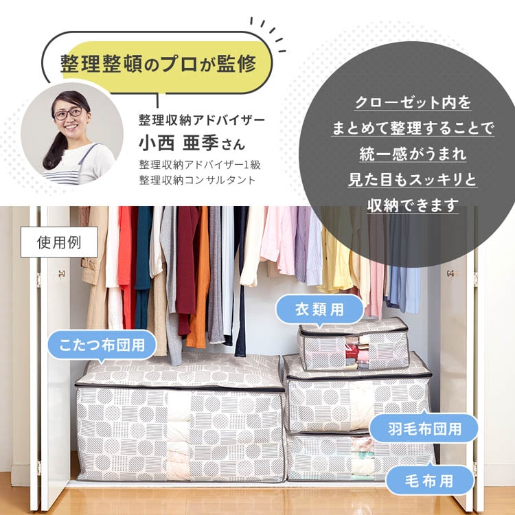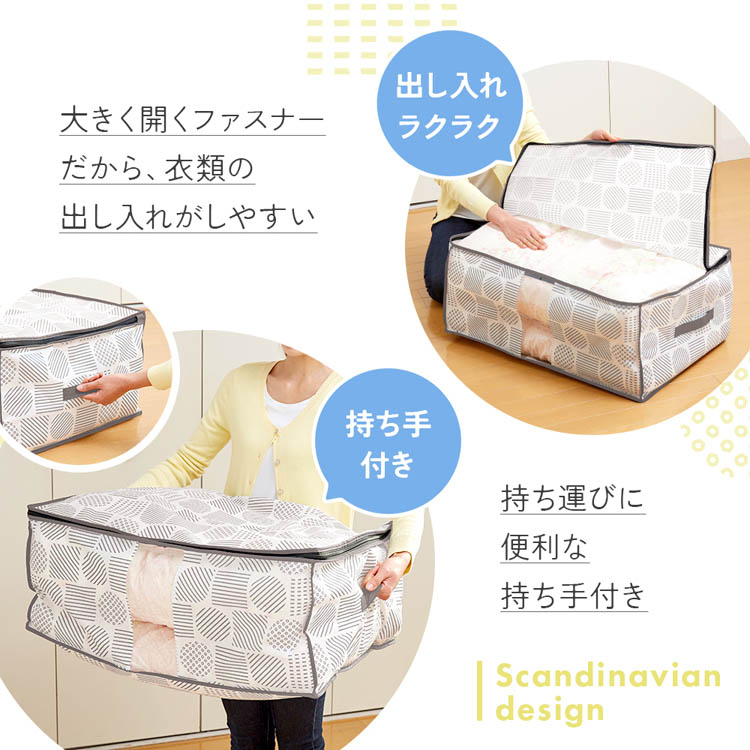 | ・商品サイズ/(約)70×50×30cm ・材質/生地:ポリプロピレン不織布、透明窓:EVA樹脂 ・収納目安/羽毛布団1~2枚 |