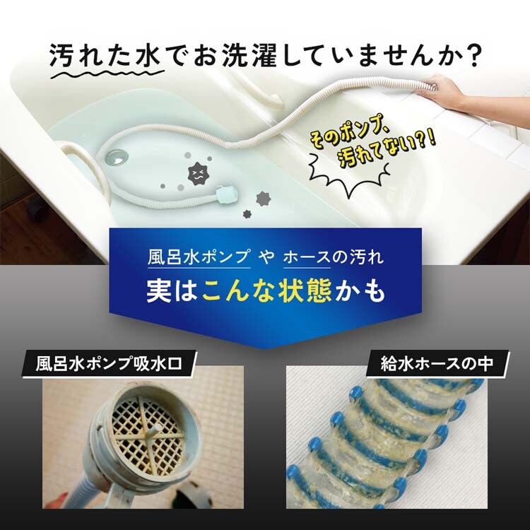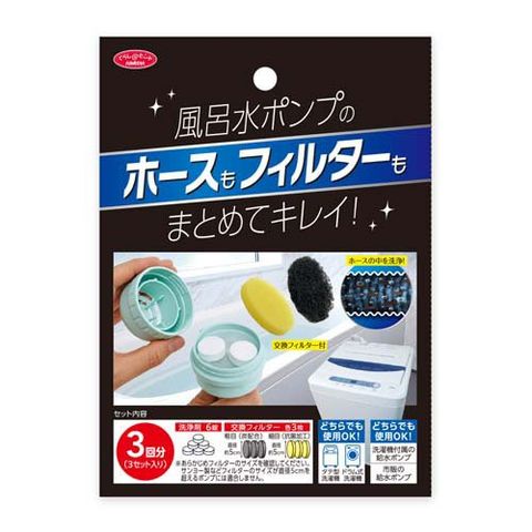 | ・正味量:4g×6錠(3回分) ・液性:弱アルカリ性 ・材質:粗目フィルター:ポリエステル・細目フィルター:ポリウレタン ・用途:縦型・ドラム式洗濯機用の風呂水給水用ポンプ内の洗浄 ・使用量目安:1回2錠(月に1~2回の使用をおすすめします) |