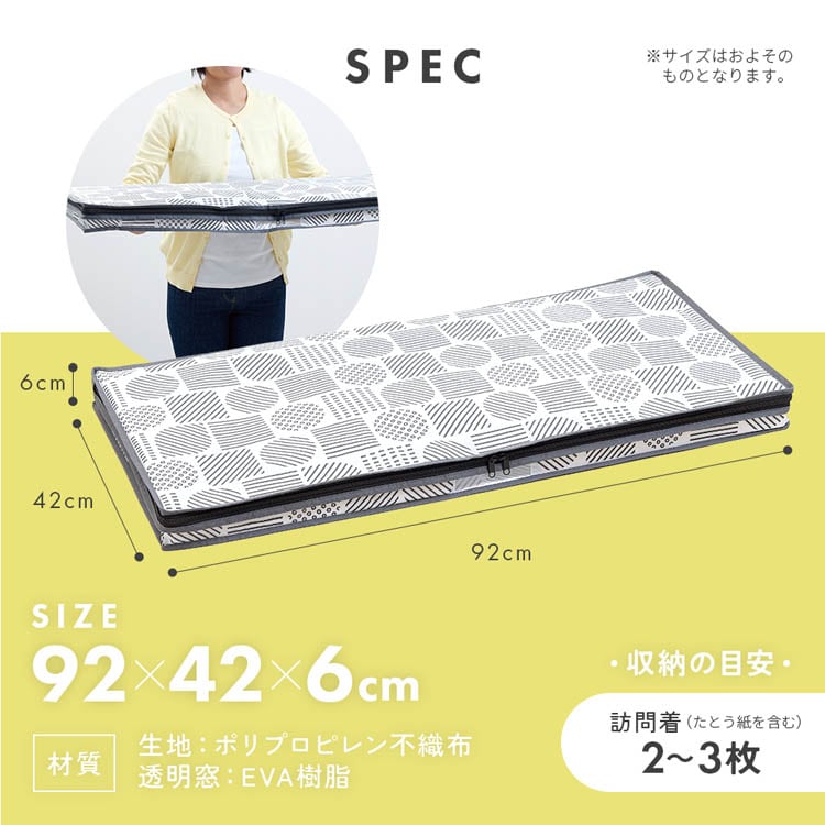 | ・商品サイズ/(約)92×42×6cm ・収納目安/訪問着2~3枚(たとう紙を含む) ・材質/生地:ポリプロピレン不織布・透明窓:EVA樹脂 |