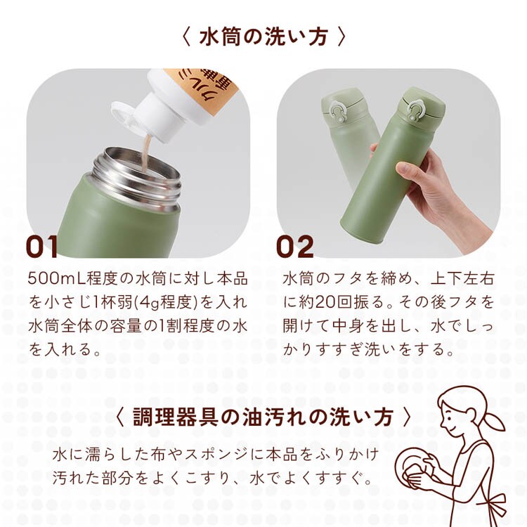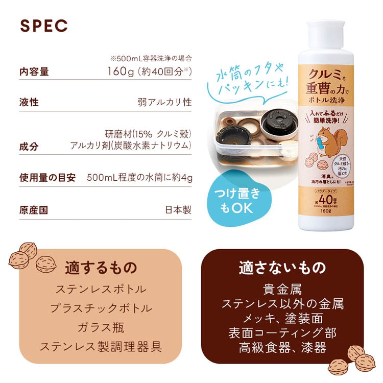 | ・成分/研磨材(15% クルミ殻)・アルカリ剤(炭酸水素ナトリウム) ・液性/弱アルカリ性 ・用途/ステンレスボトル・プラスチックボトル・ガラス瓶・ステンレス製調理器具 ・適さないもの/貴金属・ステンレス以外の金属・メッキ・塗装面・表面コーティング部・高級食器・漆器 ・使用量目安/500mL程度の水筒に(約)4g |