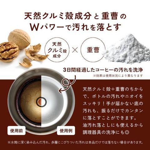 ●成分は天然クルミ殻(研磨材)と重曹のみ。ナチュラルな成分で水筒を洗浄!