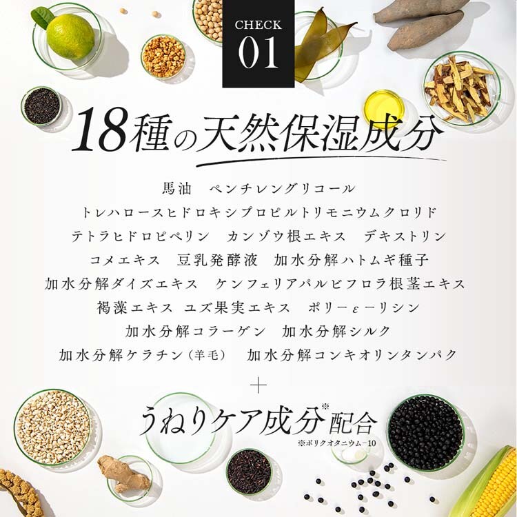 水、デシルグルコシド、ラウラミドプロピルベタイン、ペンチレングリコール、アシル(C12、14)アスパラギン酸TEA、コカミドDEA、コカミドプロピルベタイン、塩化Na、ヤシ油脂肪酸PEG-7グリセリル、ポリクオタニウム-10、トレハロースヒドロキシプロピルトリモニウムクロリド、エタノール、サリチル酸、炭酸Na、BG、ポリ-ε-リシン、加水分解コラーゲン、テトラヒドロピペリン、馬油、プロパンジオール、カンゾウ根エキス、デキストリン、コメエキス、加水分解シルク、加水分解ケラチン(羊毛)、フェノキシエタノール、加水分解コンキオリンタンパク、豆乳発酵液、加水分解ハトムギ種子、加水分解ダイズエキス、ケンフェリアパルビフロラ根茎エキス、褐藻エキス、ユズ果実エキス、クエン酸、エチドロン酸、ピロクトンオラミン、香料、HC青2、塩基性茶16、塩基性青99、HC黄4