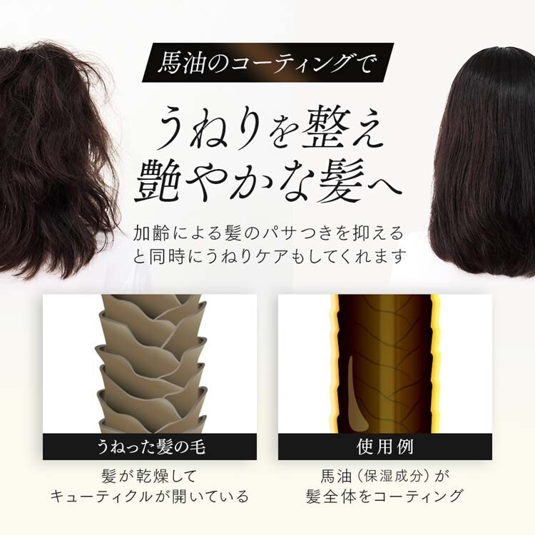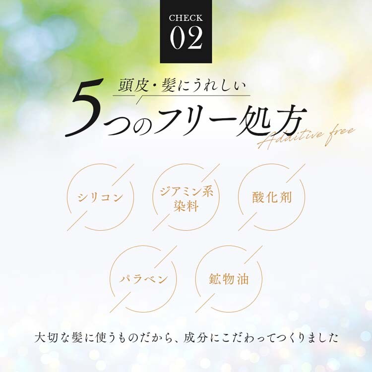 ●馬油を配合することで、傷んだ髪へ潤いを届け、艶やかな自然な髪色へと仕上げます。