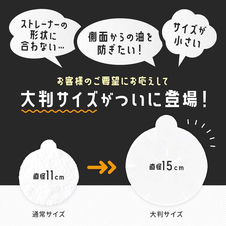 ●水を通して油は吸収!様々な形状のストレーナーや三角コーナーに対応した大判タイプ。底に敷くだけで食べ物や食器に残った油、水切りネットでは取りきれない細かいゴミもキャッチします。1枚で約55gの油を吸収。耳付きなので取り出しも簡単!サイズに合わせてハサミでカットもできます。