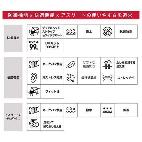 | ・素材:ポリエステル、ポリウレタン ・機能:吸汗速乾性、撥水・防汚機能、抗菌防臭、ストレッチ性、フィット性、UVカット、オープンエア構造、オープンタイプ ・仕様:防御機能(PROTECTION)/デュアルストラップ&ワイドサポート、撥水、抗菌防臭、UVカット99%以上、快適機能(COMFORT)/オープンエア構造、耳ストレス軽減、ソフトな肌あたり、ムレを軽減する通気性、吸汗速乾性、ストレッチ性、フィット性、アスリートの使いやすさ(ATHLETE-FRIENDRY)/オープンエア構造、撥水、防汚、洗濯して繰り返し使える ・原産国:台湾 |