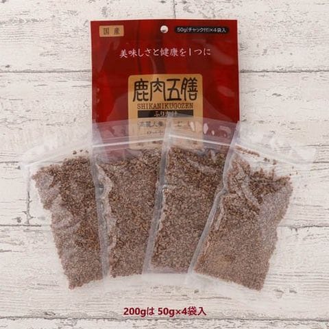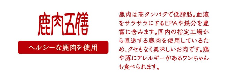 ●ヘルシーな鹿肉に、5種の高級食材(高麗人参・まむし・ローヤルゼリー・ハトムギ・霊芝)を配合