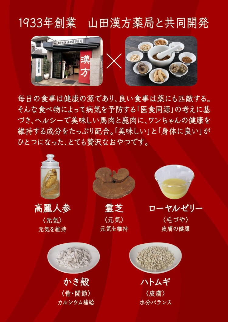 | 鹿肉(国産)、おから、ソルビトール、澱粉分解物、澱粉、グリセリン、カゼインナトリウム、高麗人参、杜仲葉、霊芝、ローヤルゼリー、かき殻、ハトムギ、鹿の角、まむし、かん骨、ローズマリー抽出物、保存料(ソルビン酸カリウム)、リン酸ナトリウム、酸化防止剤(ビタミンC、ビタミンE) |