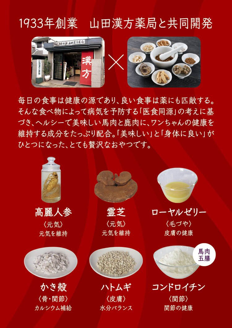 ●山田漢方薬局によるこだわりの品質の素材と、高品質の馬肉を使用した愛犬やみつきの美味しさと、健康ケア。