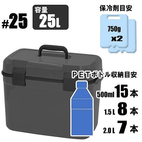 | カラー:グレー。 容量:25L。 外寸:W475×D280×H362mm。 内寸:W391×D199×H313mm。 重量:2.0kg。 保冷剤使用目安:750gタイプを2個程度。 ペットボトル収納目安:(500ml)15本。 ペットボトル収納目安:(1.5L)7本・(2L)8本。 (材質)本体・フタ・ベルト:ポリプロピレン。フタパッキン:発泡ポリエチレン。断熱材:発泡スチロール。 |
