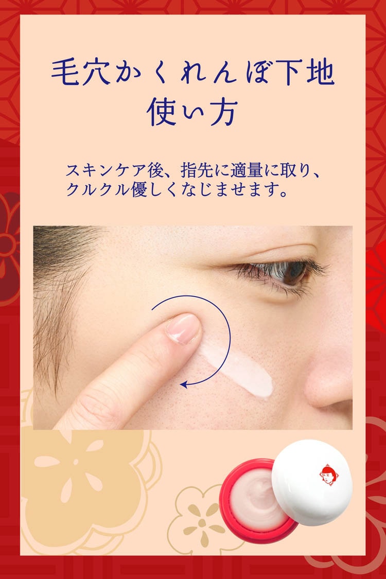 化粧水等でお肌を整えた後、指先に適量をとり気になる毛穴にクルクルとすり込むようにやさしくなじませます。