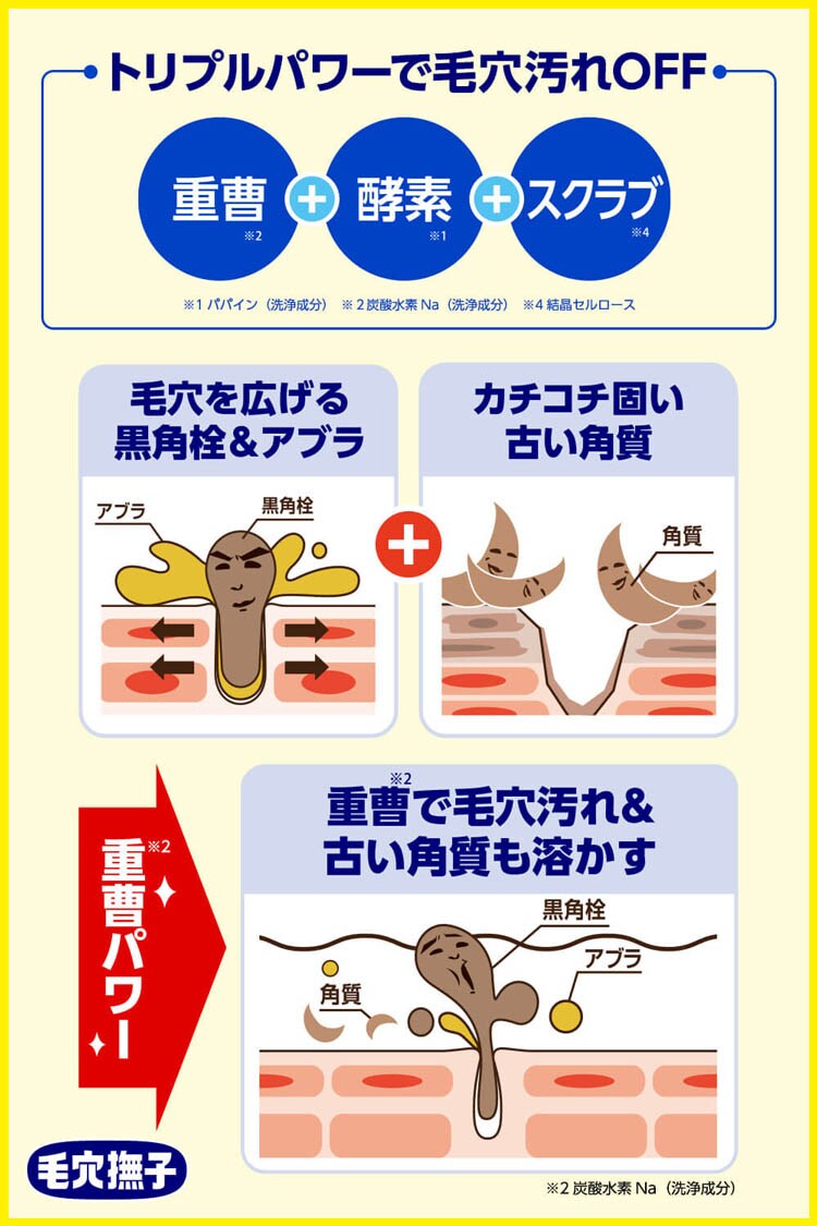 ●アブラや汚れからできた角栓が酸化して黒くなり詰まった状態の【キウイ毛穴】、毛穴が開いたまま古い角質が固くなって凸凹した状態の【オレンジ毛穴】は、重曹inのトリプルパワーで毛穴汚れをやさしくOFF!