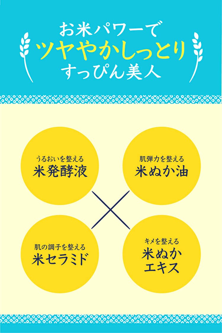 | 水、BG、コメヌカ油、グリセリン、パルミチン酸エチルへキシル、ポリソルベート60、セタノール、ステアリン酸グリセリル、コメ発酵液、コメヌカエキス、コメヌカスフィンゴ糖脂質、アーチチョーク葉エキス、シア脂、乳酸桿菌、ベヘニルアルコール、ワセリン、水添レシチン、水添リゾレシチン、ペンチレングリコール、アルギニン、カルボマー、トコフェロール、マルトデキストリン、(ポリアクリル酸Na/ジアクリル酸PEG-9)クロスポリマー、シクロペンタシロキサン、水酸化K、フィチン酸、メチルパラベン、プロピルパラベン |
