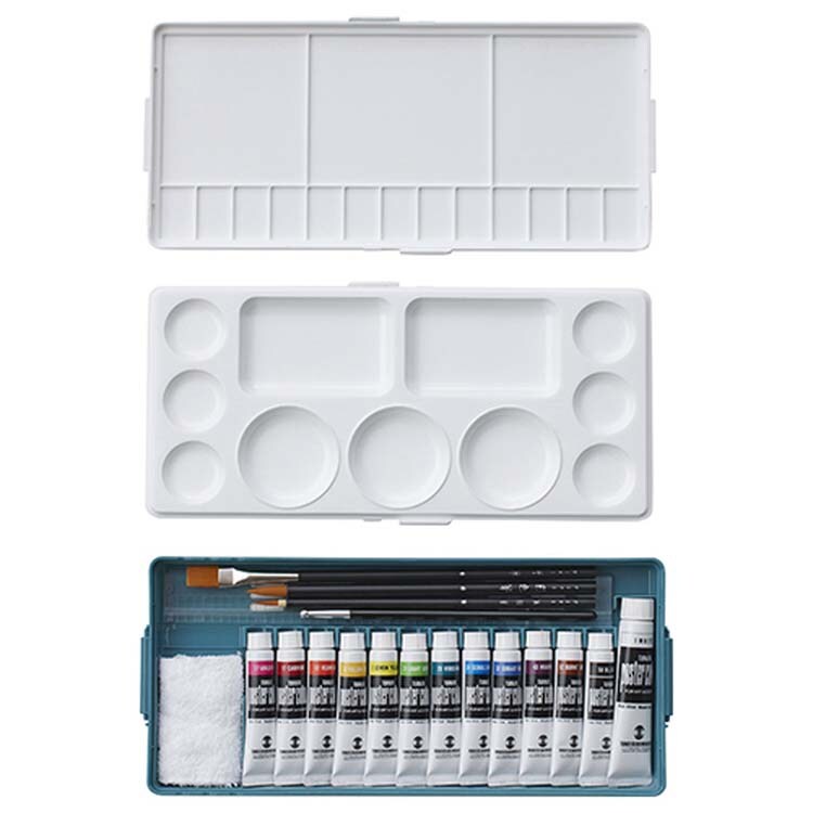 | ・付属品:Wパレット付きケース・絵具12色+マゼンタ1本+ホワイト・黒軸デザイン棒(ナイロン)3本(面相筆・彩色筆・平筆)・黒軸棒・アクリル製ミゾ付定規(25cm)・ミニふきん |