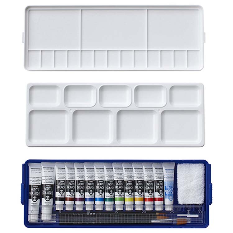 ・パレットはどんな種類でも使えますが、木製やプラスチック製のものは、絵具が乾燥すると強く接着する場合がありますので、使用しないでください。