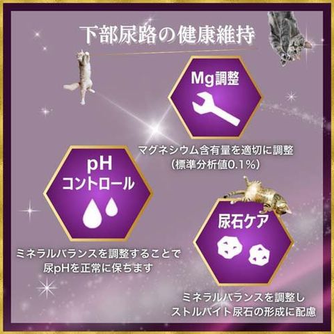 ●ミネラルバランスを調整することで尿pHを正常に保ち、ストルバイト尿石の形成にも配慮